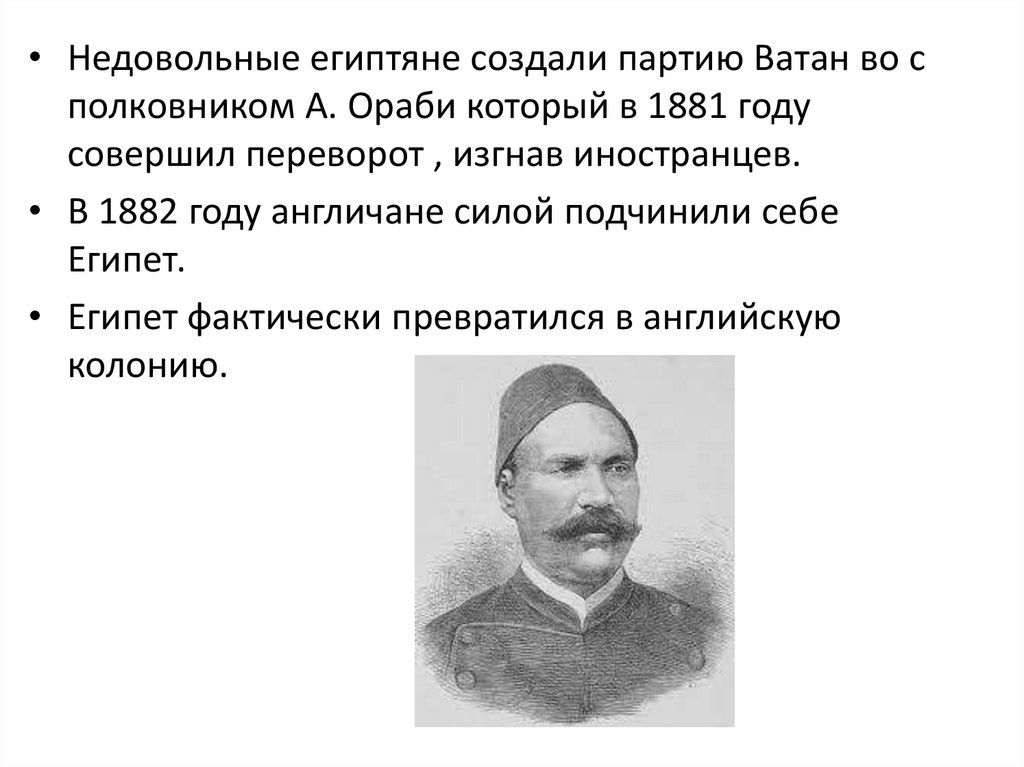 • Недовольные египтяне создали партию Ватан во сполковником А. Ораби который в 1881 году