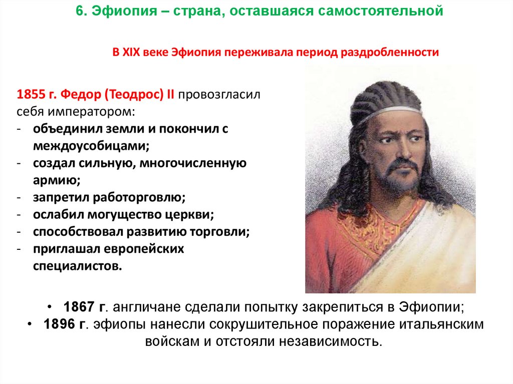 6. Эфиопия – страна, оставшаяся самостоятельнойВ XIX веке Эфиопия переживала период раздробленности