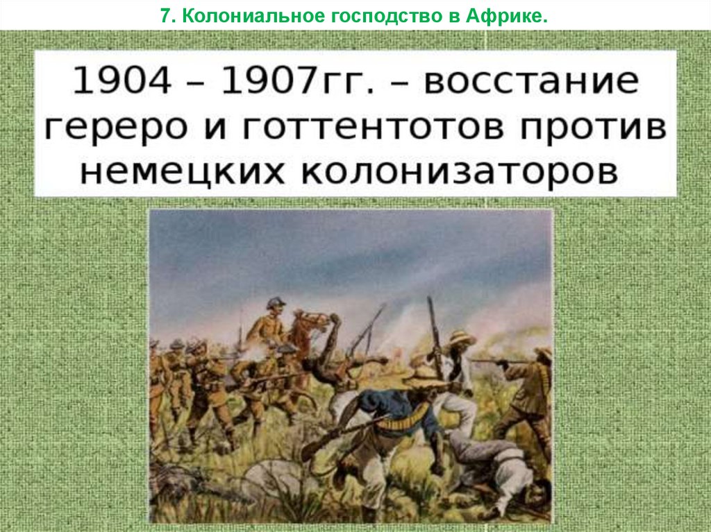 7. Колониальное господство в Африке.20. Впервые применяется геноцид. Записать понятие: Геноцид – массовое уничтожение людей по этническому признаку.