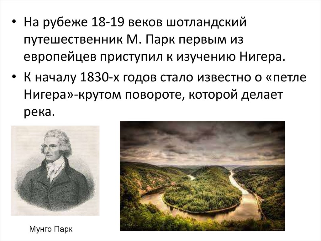 • На рубеже 18-19 веков шотландскийпутешественник М. Парк первым из