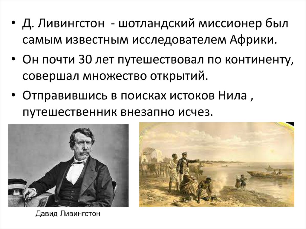 • Д. Ливингстон - шотландский миссионер былсамым известным исследователем Африки.