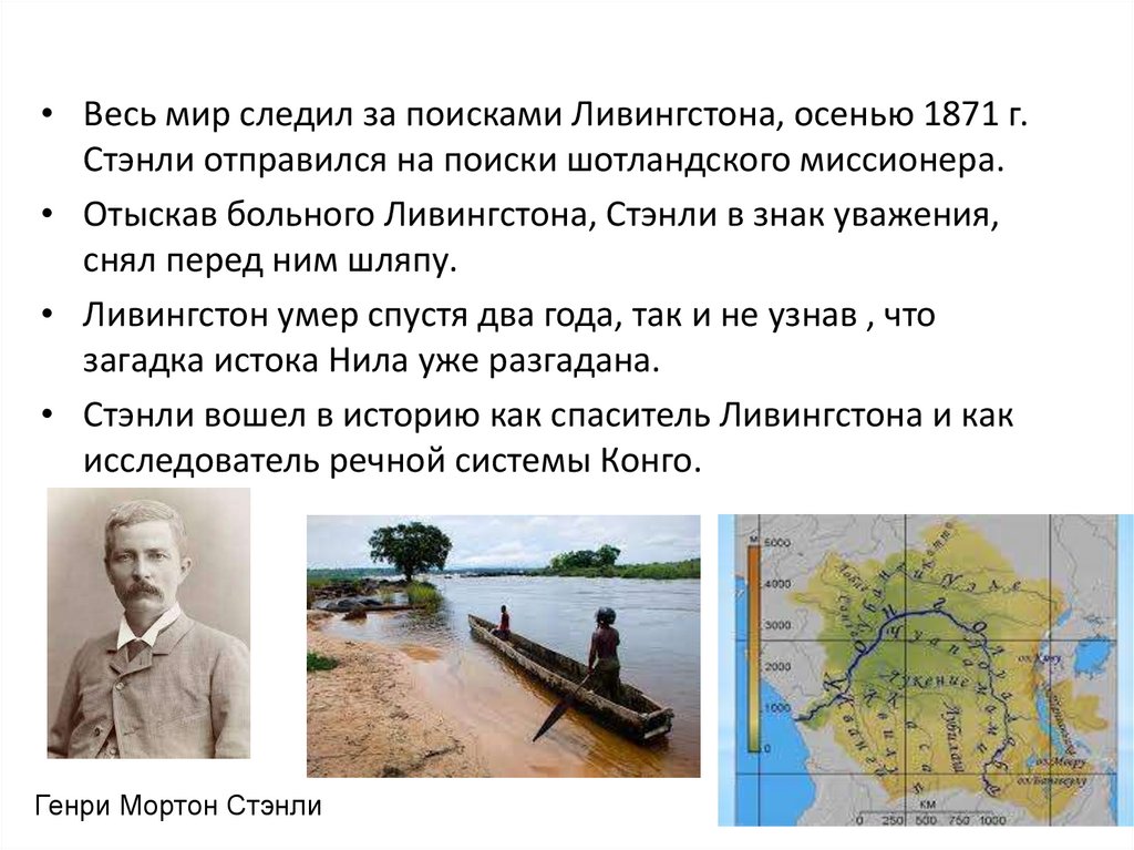 • Весь мир следил за поисками Ливингстона, осенью 1871 г.Стэнли отправился на поиски шотландского миссионера.