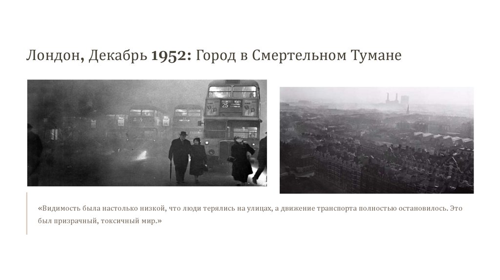 Лондон, Декабрь 1952: Город в Смертельном Тумане«Видимость была настолько низкой, что люди терялись на улицах, а движение транспорта полностью остановилось. Это