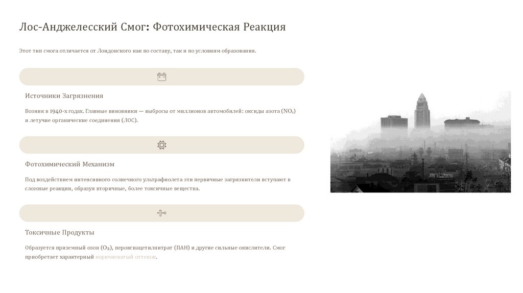 Лос-Анджелесский Смог: Фотохимическая РеакцияЭтот тип смога отличается от Лондонского как по составу, так и по условиям образования.