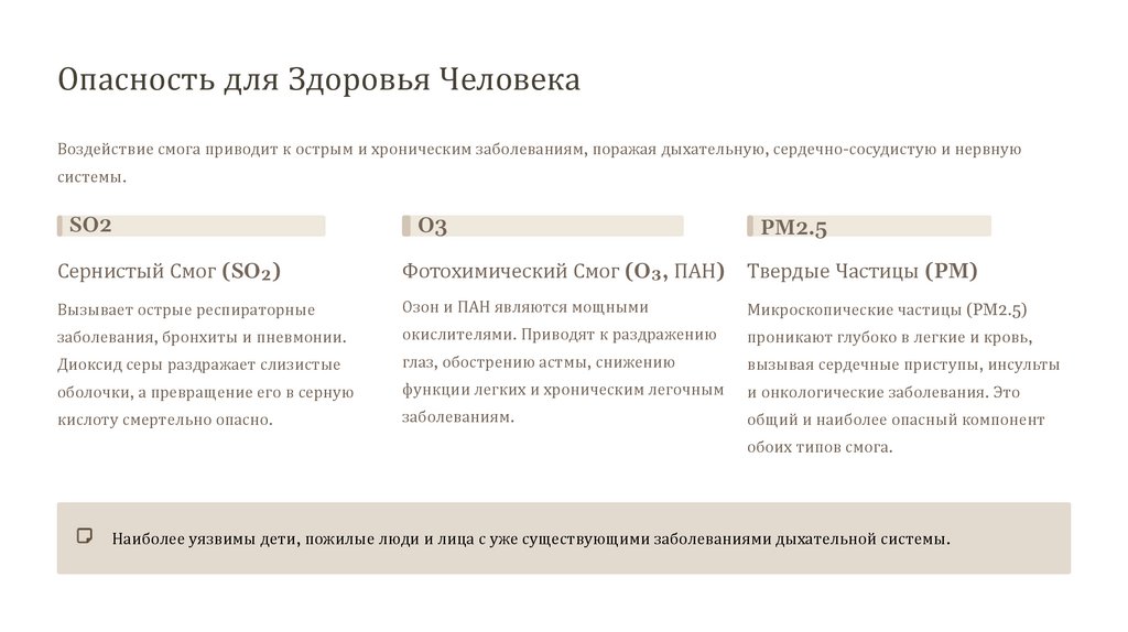 Опасность для Здоровья ЧеловекаВоздействие смога приводит к острым и хроническим заболеваниям, поражая дыхательную, сердечно-сосудистую и нервную