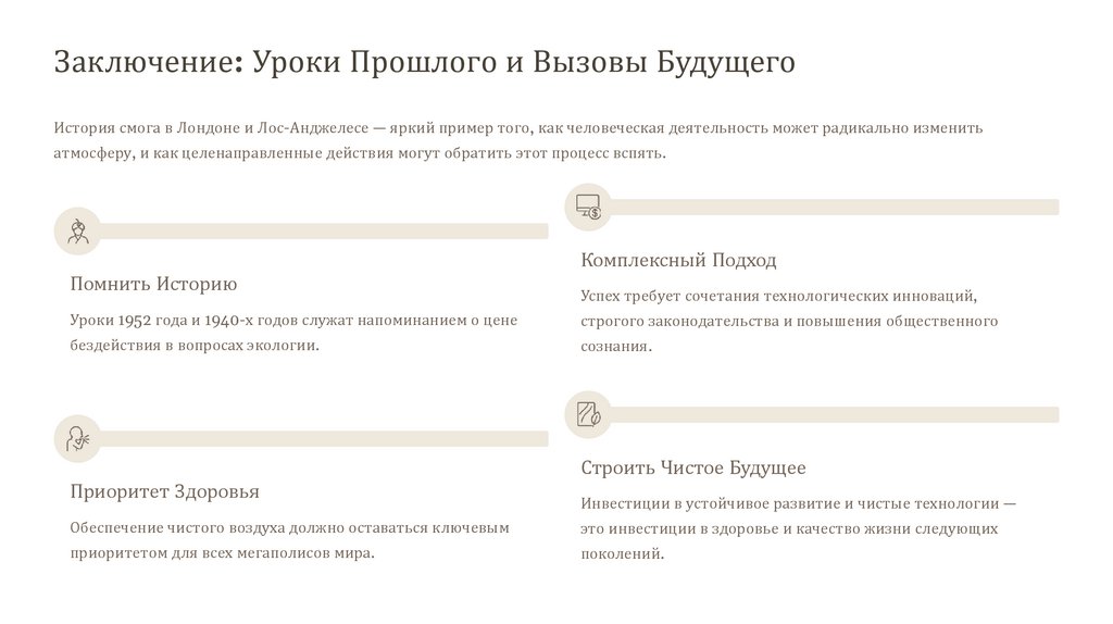 Заключение: Уроки Прошлого и Вызовы БудущегоИстория смога в Лондоне и Лос-Анджелесе — яркий пример того, как человеческая деятельность может радикально изменить