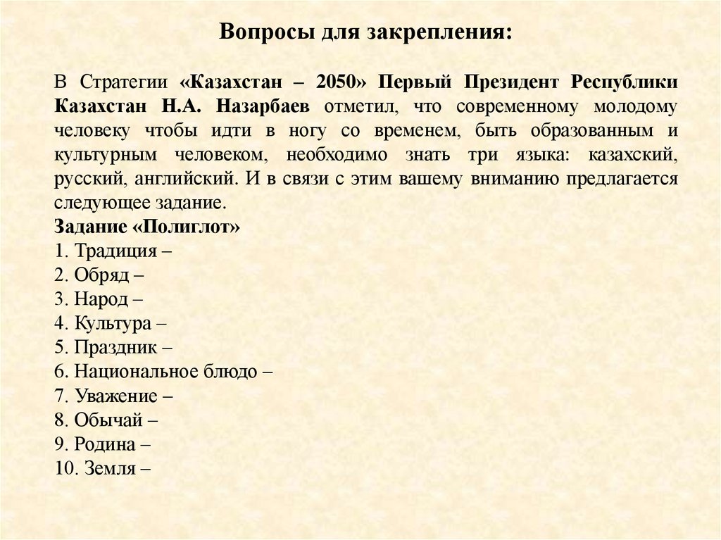 Вопросы для закрепления:В Стратегии «Казахстан – 2050» Первый Президент Республики