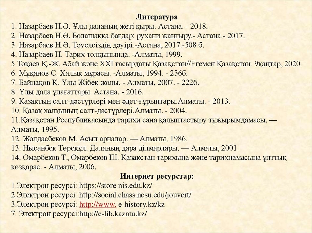 Литература1. Назарбаев Н.Ә. Ұлы даланың жеті қыры. Астана. - 2018.