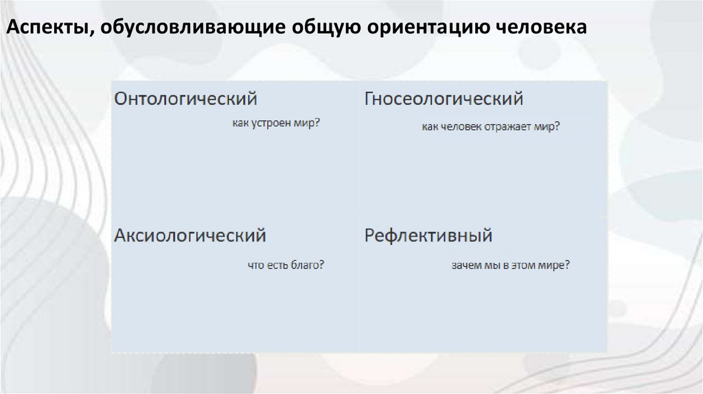 Аспекты, обусловливающие общую ориентацию человекакак устроен мир?