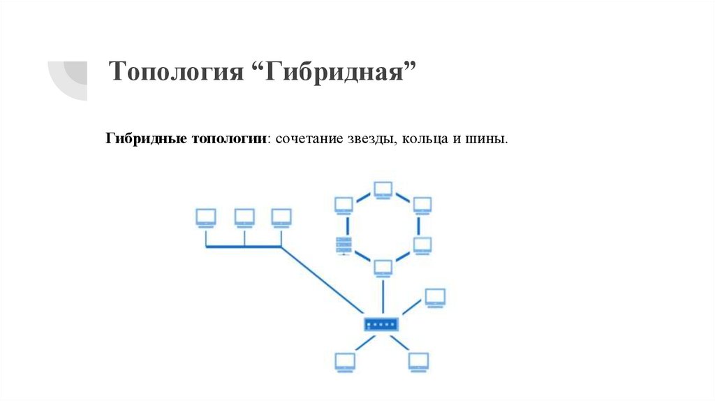 Топология “Гибридная”Гибридные топологии: сочетание звезды, кольца и шины.