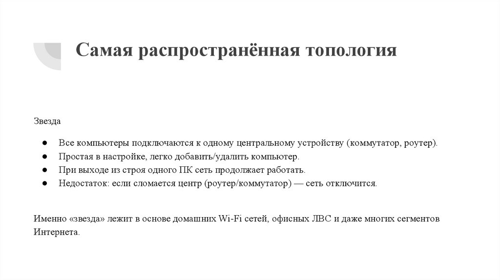 Именно «звезда» лежит в основе домашних Wi-Fi сетей, офисных ЛВС и даже многих сегментов