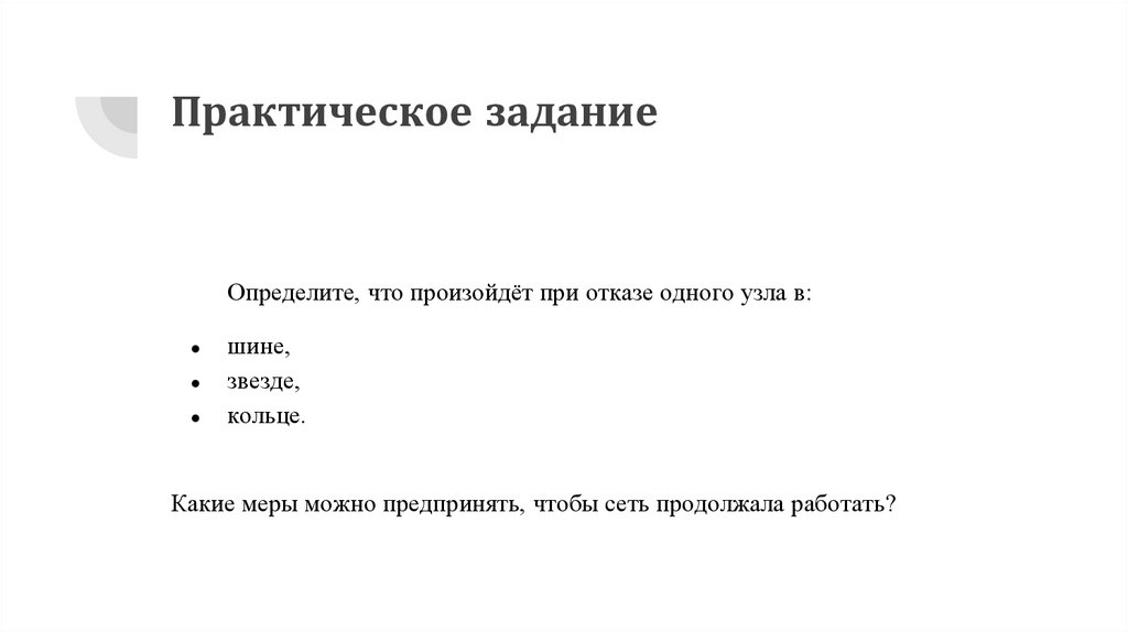 Практическое заданиеОпределите, что произойдёт при отказе одного узла в: