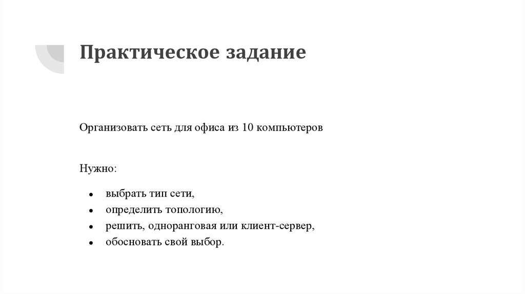 Практическое заданиеОрганизовать сеть для офиса из 10 компьютеров