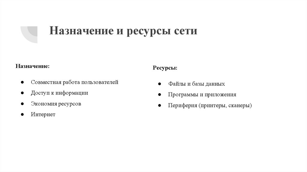 Назначение сети — совместное использование ресурсов (программ, файлов, устройств, Интернета).