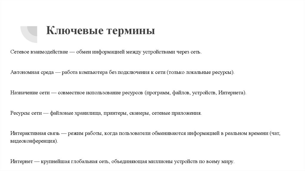Ключевые терминыСетевое взаимодействие — обмен информацией между устройствами через сеть.