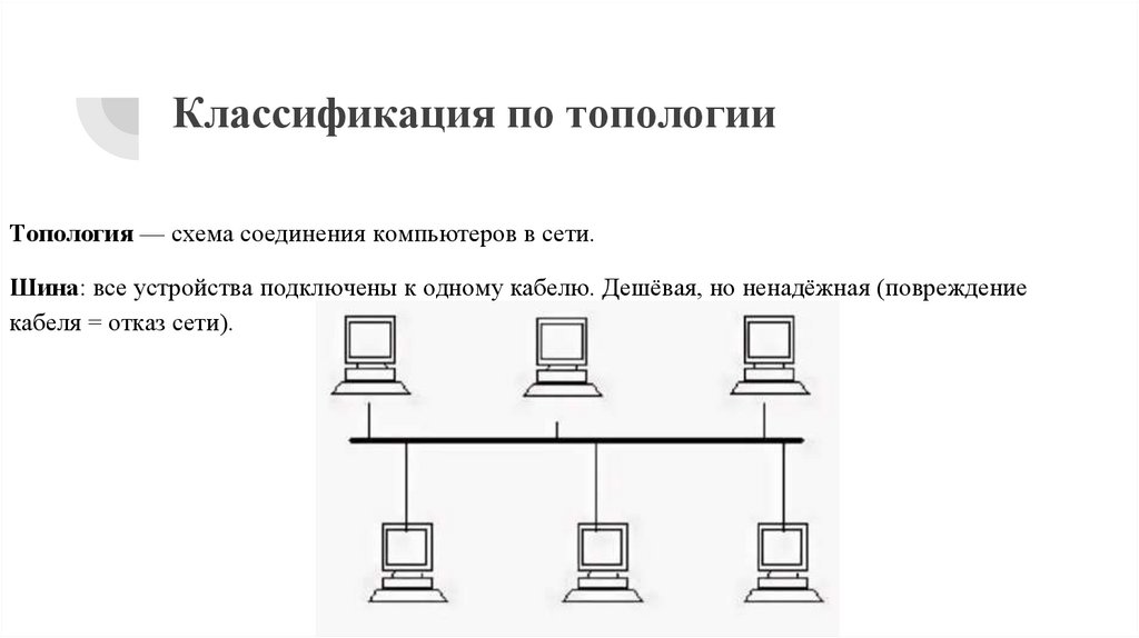 Классификация по топологииТопология — схема соединения компьютеров в сети.