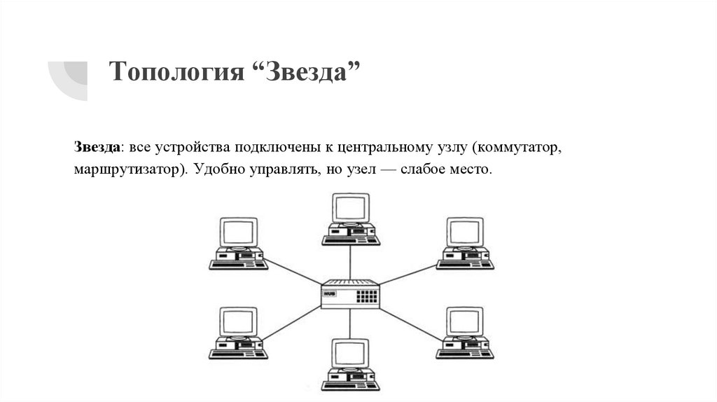 Топология “Звезда”Звезда: все устройства подключены к центральному узлу (коммутатор,