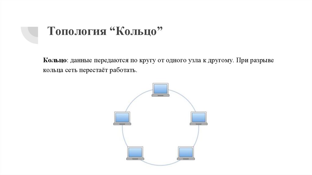 Топология “Кольцо”Кольцо: данные передаются по кругу от одного узла к другому. При разрыве