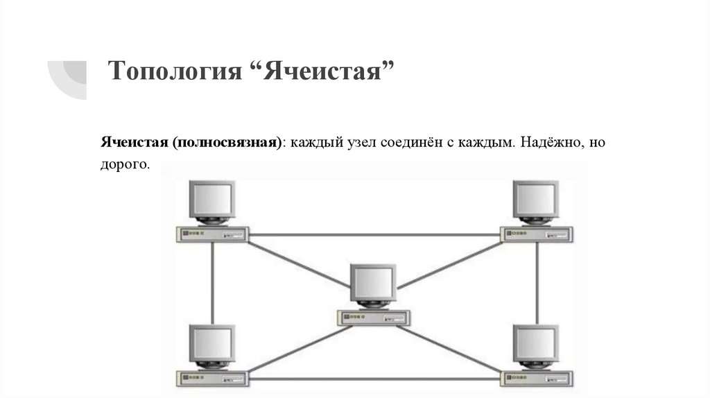 Топология “Ячеистая”Ячеистая (полносвязная): каждый узел соединён с каждым. Надёжно, но