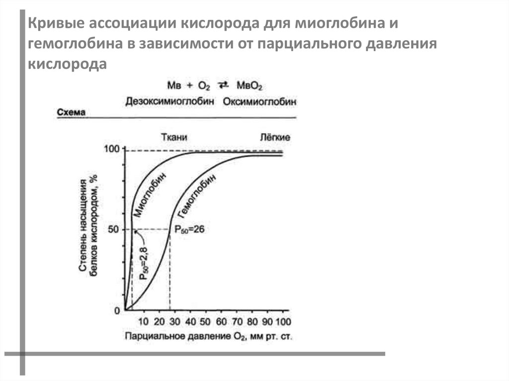 Кривые ассоциации кислорода для миоглобина игемоглобина в зависимости от парциального давления