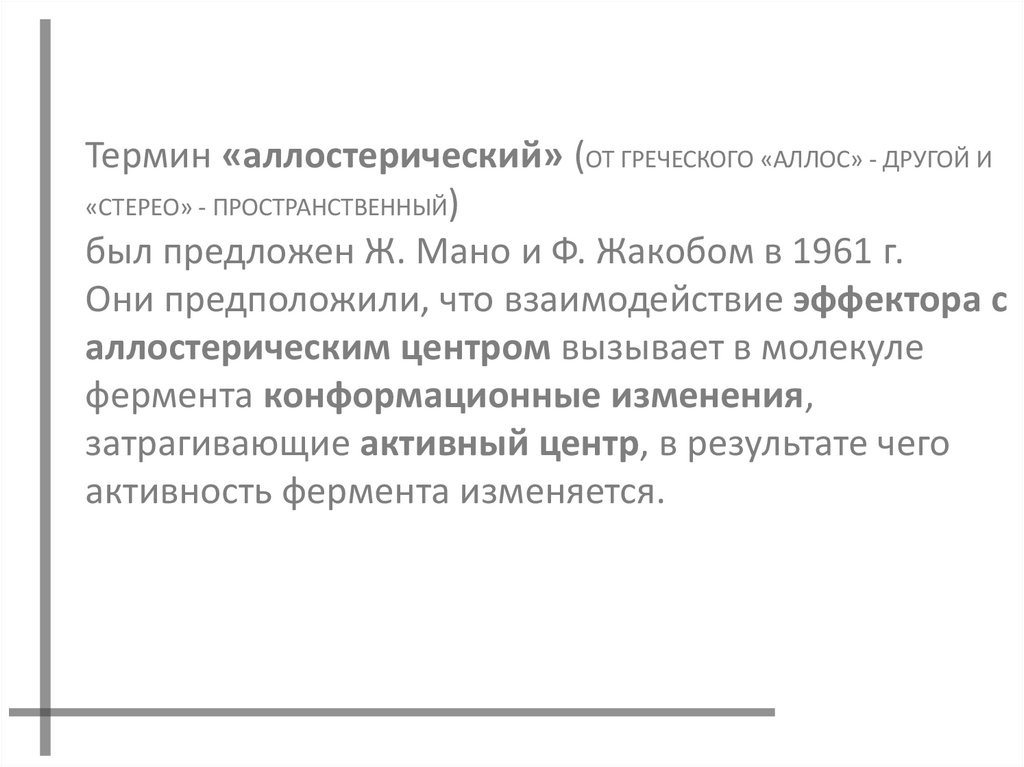Термин «аллостерический» (ОТ ГРЕЧЕСКОГО «АЛЛОС» - ДРУГОЙ И«СТЕРЕО» - ПРОСТРАНСТВЕННЫЙ)