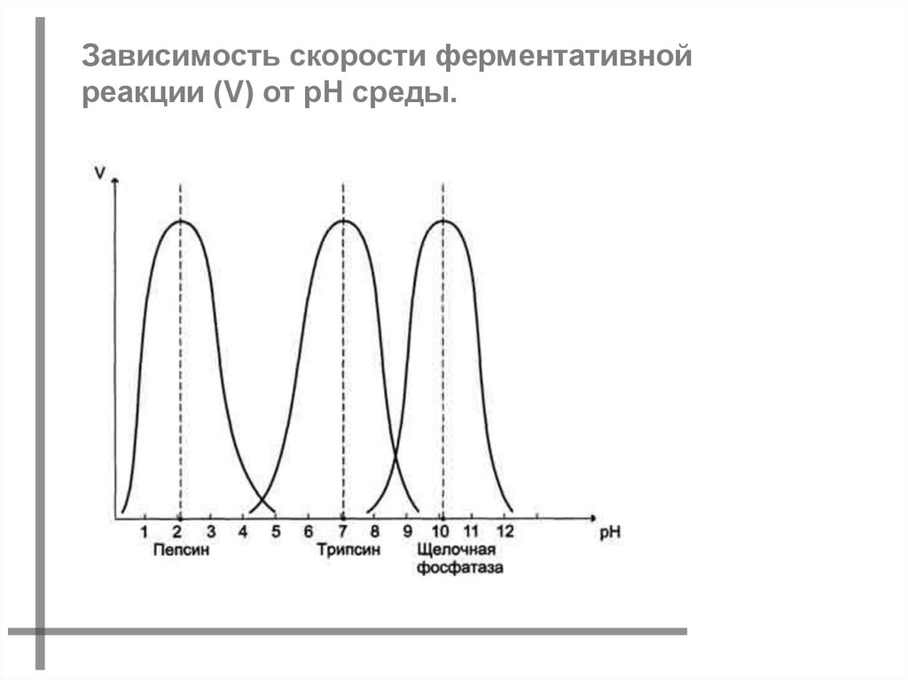 Зависимость скорости ферментативнойреакции (V) от рН среды.
