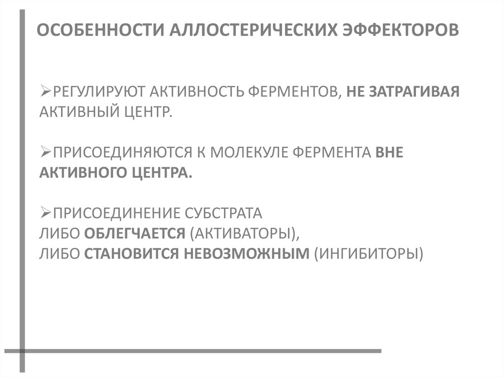 ОСОБЕННОСТИ АЛЛОСТЕРИЧЕСКИХ ЭФФЕКТОРОВРЕГУЛИРУЮТ АКТИВНОСТЬ ФЕРМЕНТОВ, НЕ ЗАТРАГИВАЯ