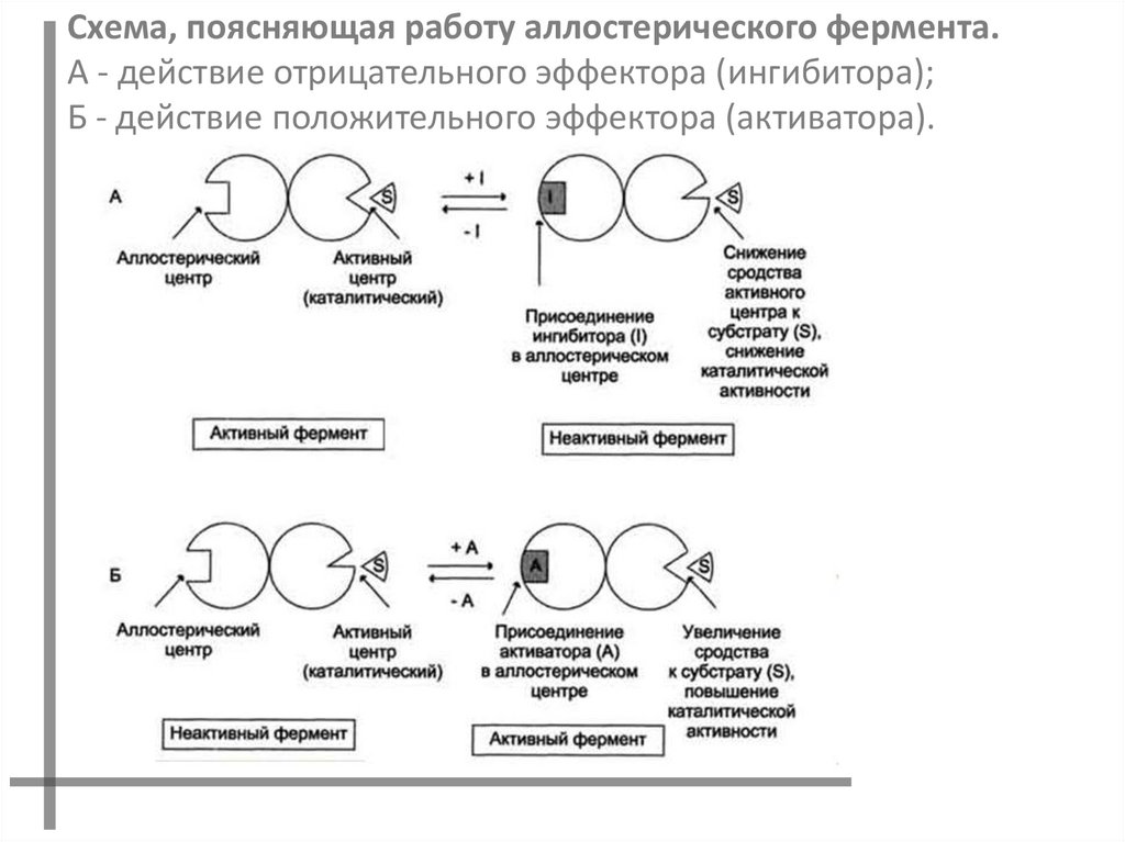 Схема, поясняющая работу аллостерического фермента.А - действие отрицательного эффектора (ингибитора);