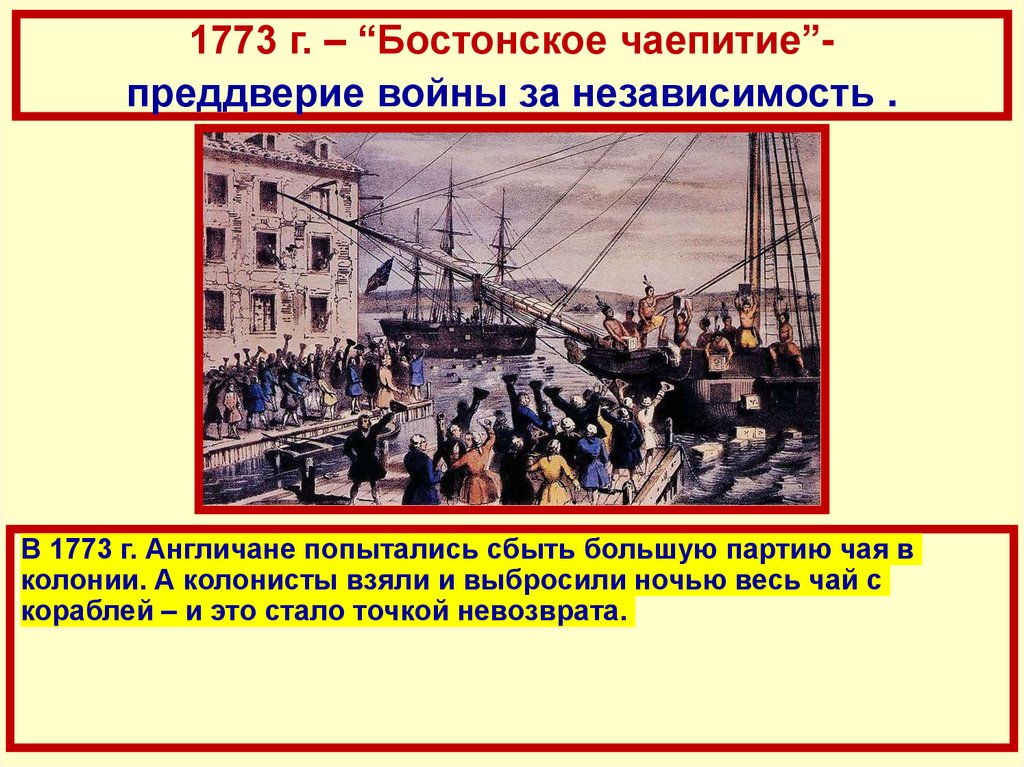 1773 г. – “Бостонское чаепитие”преддверие войны за независимость .В 1773 г. Англичане попытались сбыть большую партию чая в