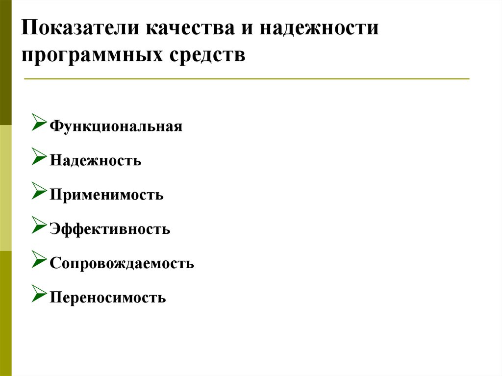 Показатели качества и надежности программных средств6 основных характеристик качества ПС, каждая из которых детализируется