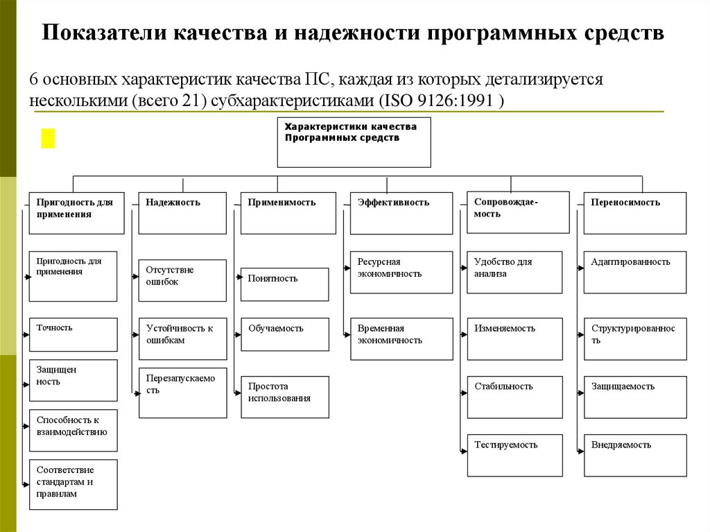 несколькими (всего 21) субхарактеристиками (ISO 9126:1991 )