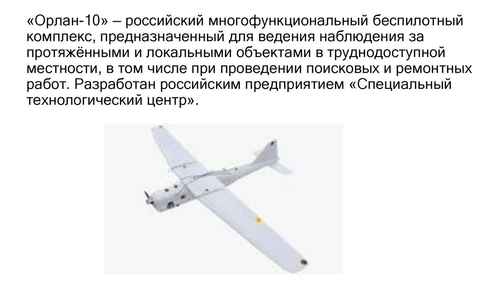 «Орлан-10» — российский многофункциональный беспилотныйкомплекс, предназначенный для ведения наблюдения за