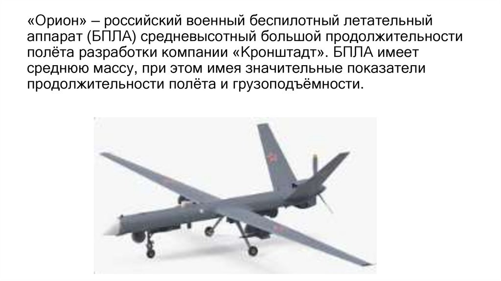 «Орион» — российский военный беспилотный летательныйаппарат (БПЛА) средневысотный большой продолжительности