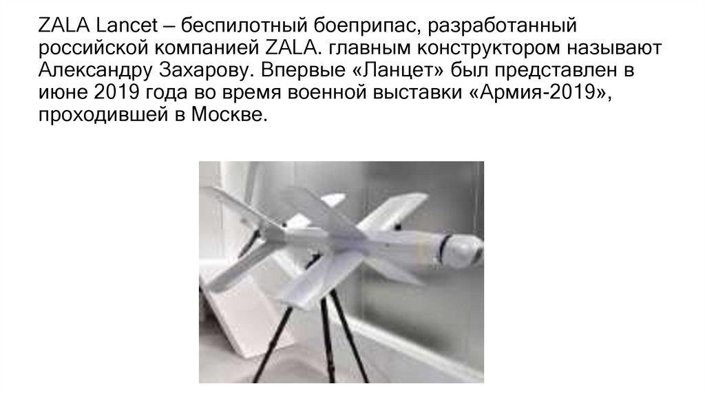ZALA Lancet — беспилотный боеприпас, разработанныйроссийской компанией ZALA. главным конструктором называют