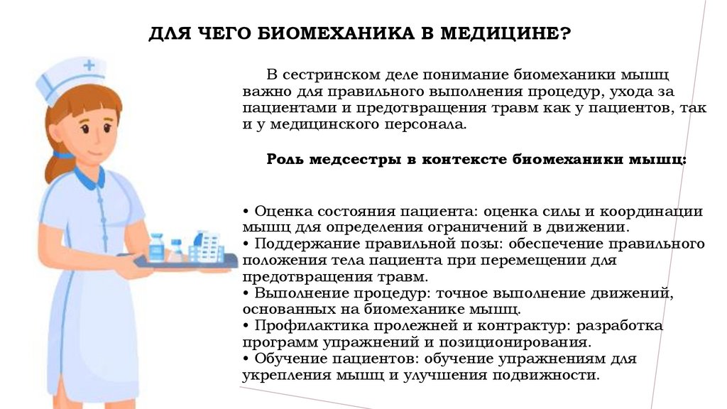 ДЛЯ ЧЕГО БИОМЕХАНИКА В МЕДИЦИНЕ?В сестринском деле понимание биомеханики мышц