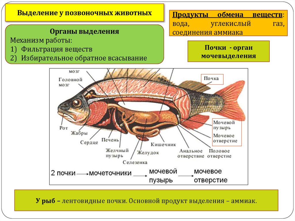 У рыб – лентовидные почки. Основной продукт выделения – аммиак.