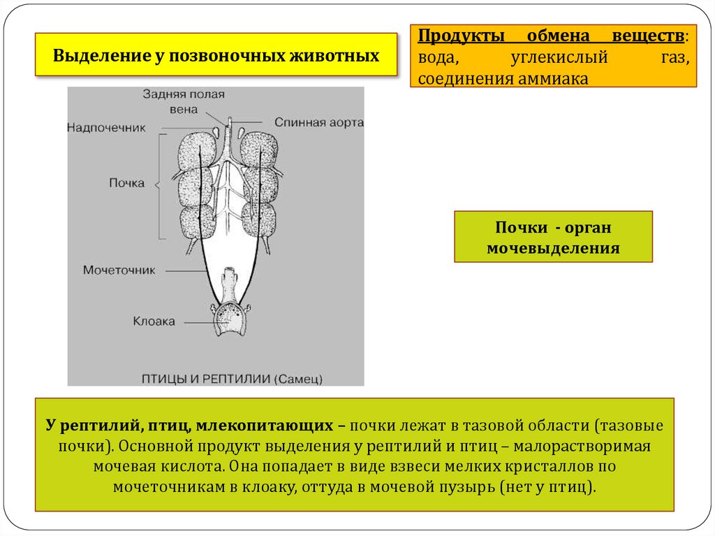 почки). Основной продукт выделения у рептилий и птиц – малорастворимая