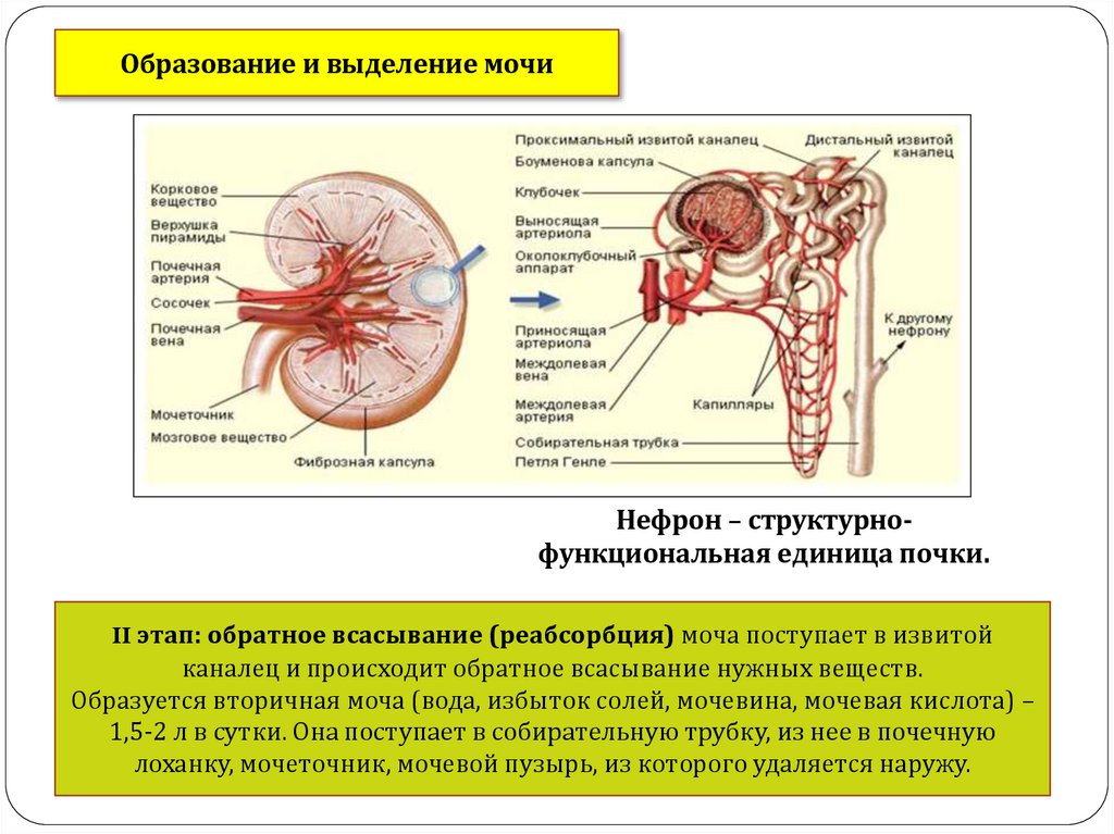 Образуется вторичная моча (вода, избыток солей, мочевина, мочевая кислота) –