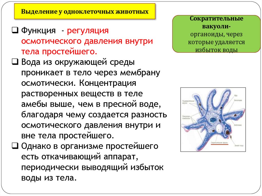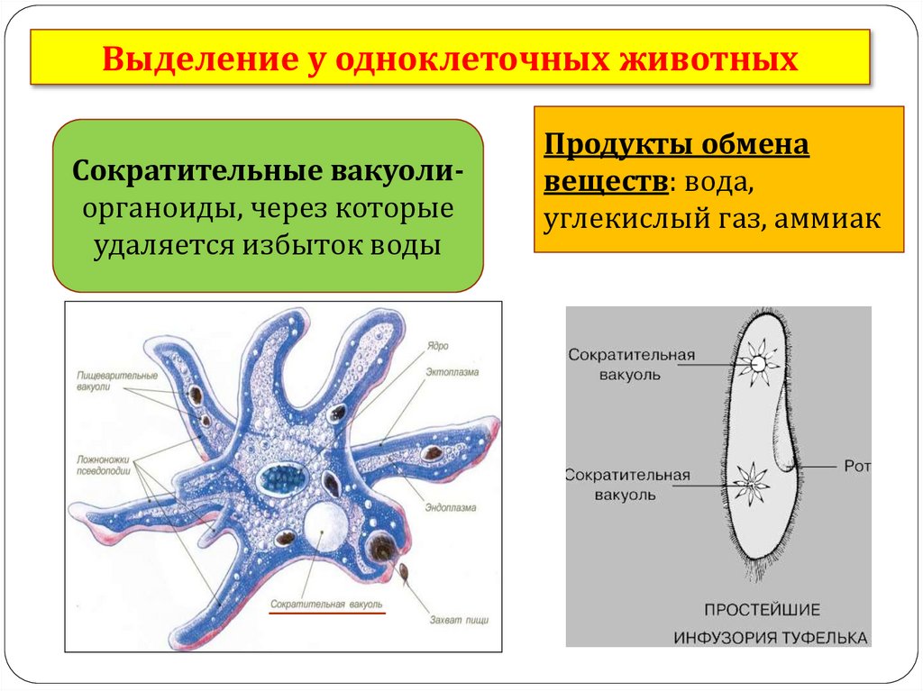 Выделение у одноклеточных животныхСократительные вакуолиорганоиды, через которые