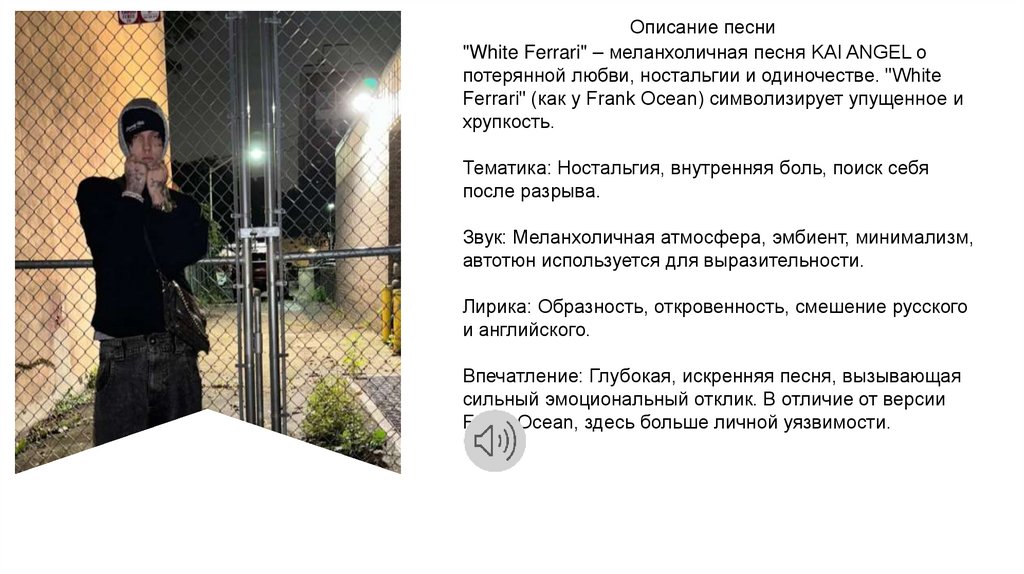 Описание песни"White Ferrari" – меланхоличная песня KAI ANGEL о