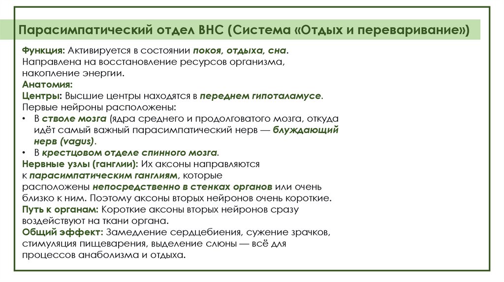 Парасимпатический отдел ВНС (Система «Отдых и переваривание»)Функция: Активируется в состоянии покоя, отдыха, сна.