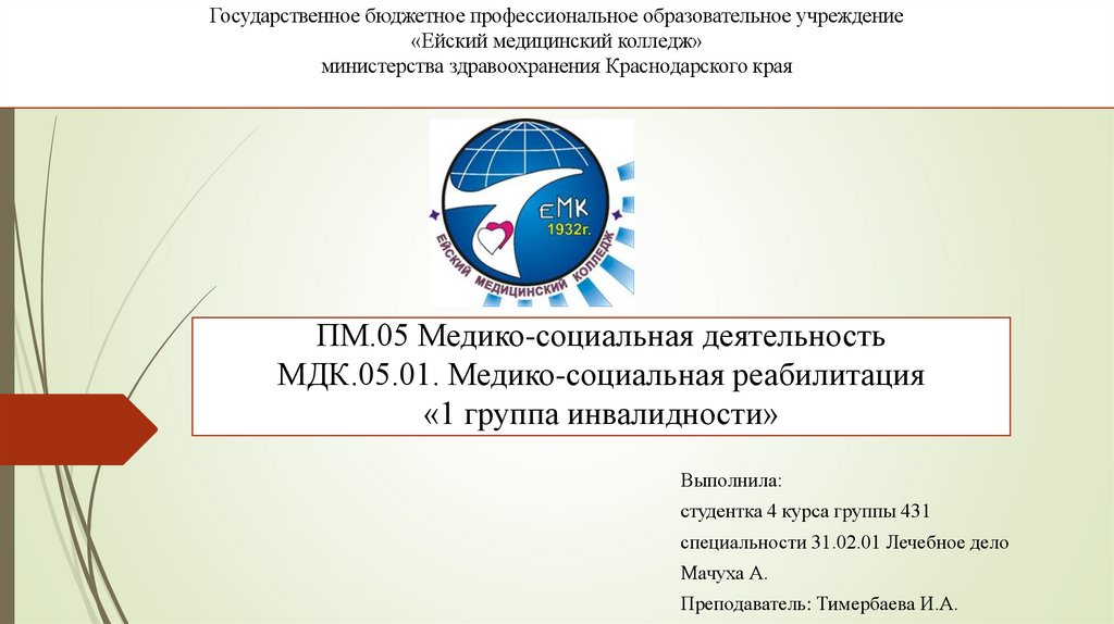 1. ПМ.05 Медико-социальная деятельность МДК.05.01. Медико-социальная реабилитация «1 группа инвалидности»