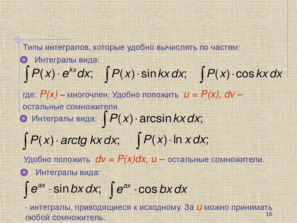 Типы интегралов, которые удобно вычислять по частям:Интегралы вида: