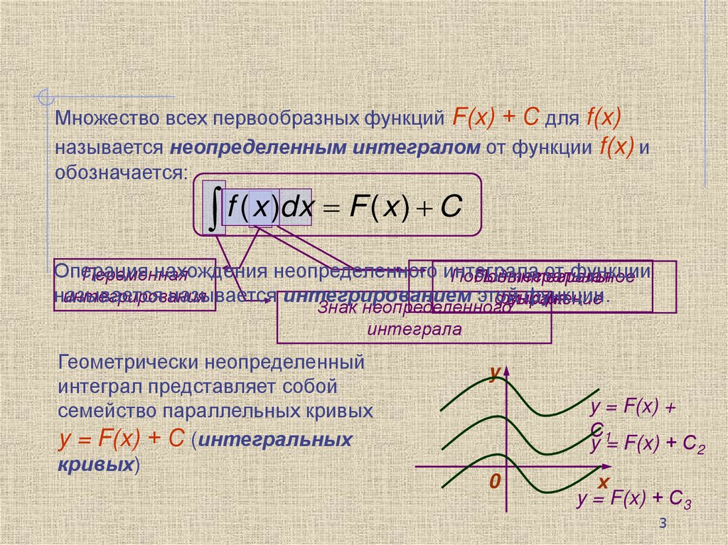 Множество всех первообразных функций F(x) + С для f(x)называется неопределенным интегралом от функции f(x) и