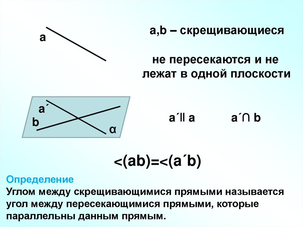 Теорема о скрещивающихся прямыхЧерез каждую из двух скрещивающихся прямых проходит