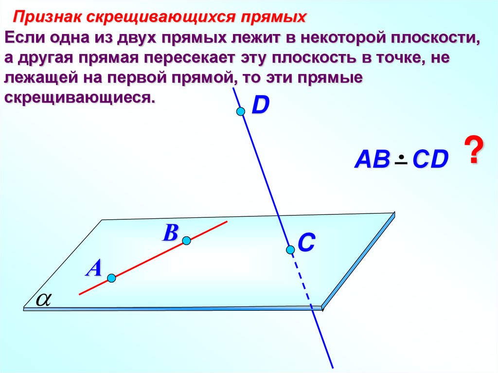 Признак скрещивающихся прямыхЕсли одна из двух прямых лежит в некоторой плоскости,