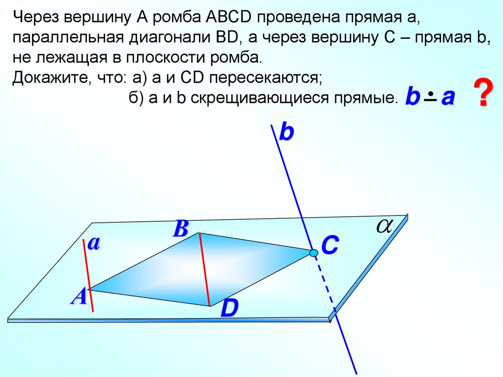 Через вершину А ромба АВСD проведена прямая а,параллельная диагонали ВD, а через вершину С – прямая b,
