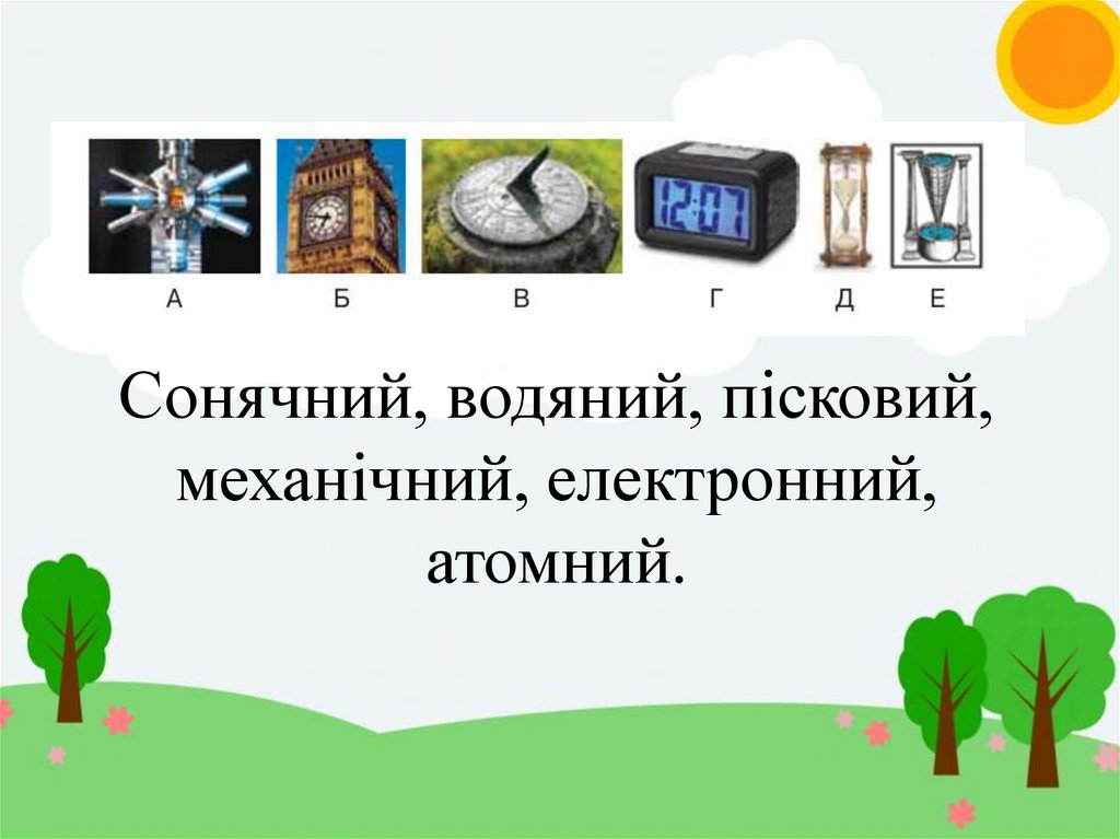 Сонячний, водяний, пісковий,механічний, електронний,