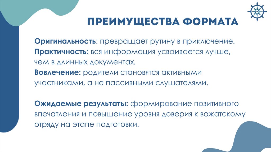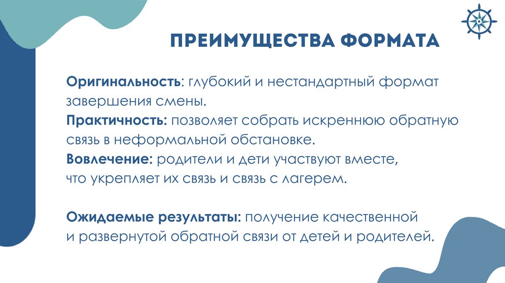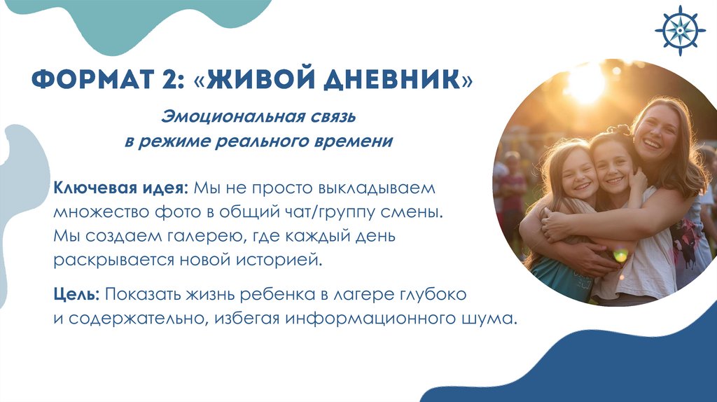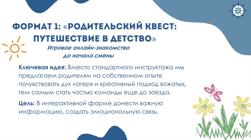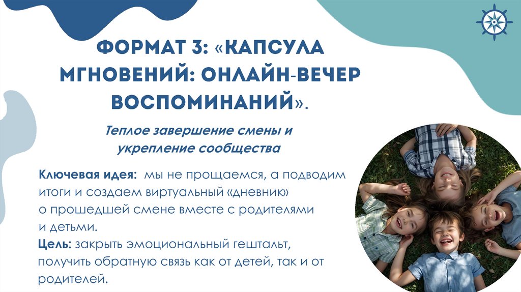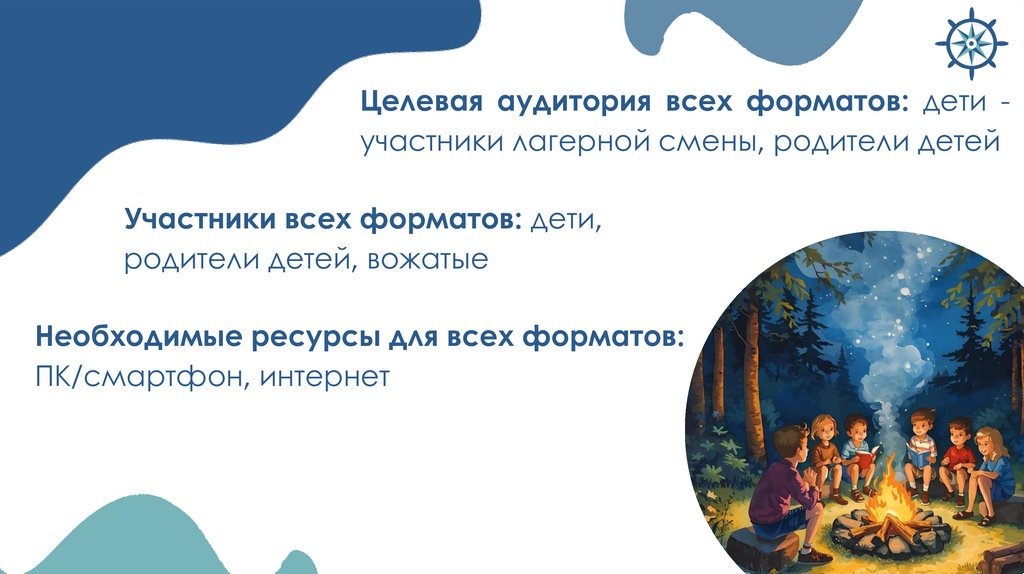 Целевая аудитория всех форматов: дети участники лагерной смены, родители детейУчастники всех форматов: дети,