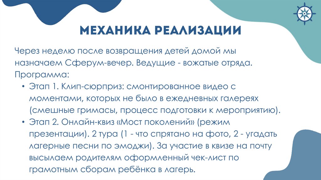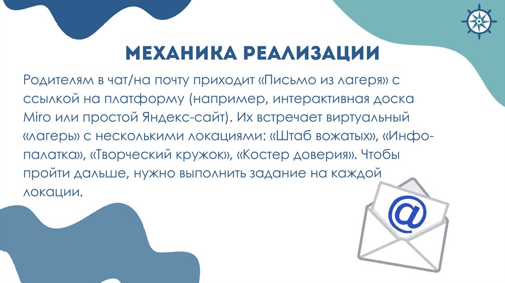 «лагерь» с несколькими локациями: «Штаб вожатых», «Инфопалатка», «Творческий кружок», «Костер доверия». Чтобы